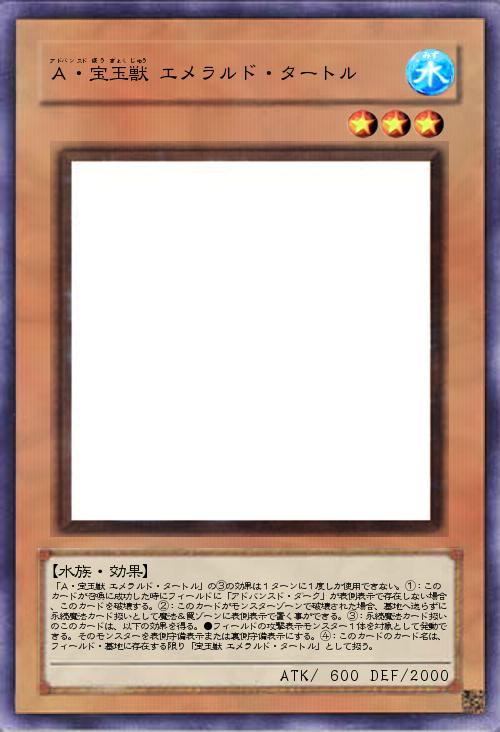 「A・宝玉獣 エメラルド・タートル」の③の効果は1ターンに1度しか使用できない。①:このカードが召喚に成功した時にフィールドに「アドバンスド・ダーク」が表側表示で存在しない場合、このカードを破壊する。②:このカードがモンスターゾーンで破壊された場合、墓地へ送らずに永続魔法カード扱いとして魔法&罠ゾーンに表側表示で置く事ができる。③:永続魔法カード扱いのこのカードは、以下の効果を得る。●フィールドの攻撃表示モンスター1体を対象として発動できる。そのモンスターを表側守備表示または裏側守備表示にする。④:このカードのカード名は、フィールド・墓地に存在する限り「宝玉獣 エメラルド・タートル」として扱う。 |