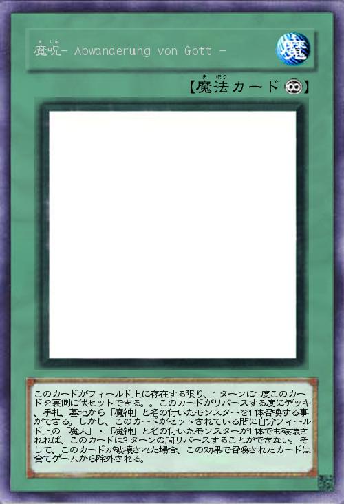 このカードがフィールド上に存在する限り、1ターンに1度このカードを裏側に伏セットできる。。このカードがリバースする度にデッキ、手札、墓地から「魔神」と名の付いたモンスターを1体召喚する事ができる。しかし、このカードがセットされている間に自分フィールド上の「魔人」・「魔神」と名の付いたモンスターが1体でも破壊されれば、このカードは3ターンの間リバースすることができない。そして、このカードが破壊された場合、この効果で召喚されたカードは全てゲームから除外される。 |