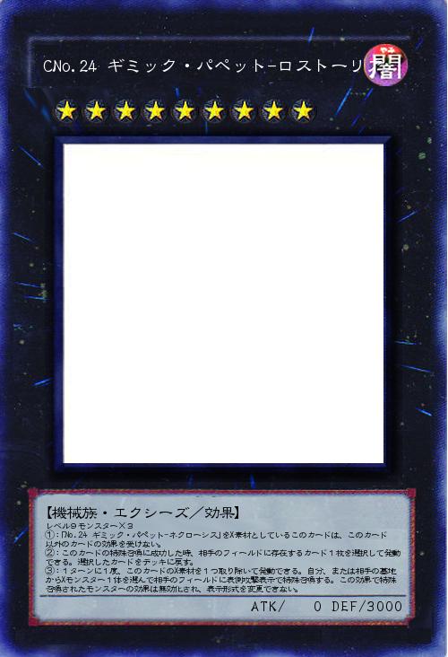 レベル9モンスター×3 ①:「No.24 ギミック・パペット-ネクローシス」をX素材としているこのカードは、このカード以外のカードの効果を受けない。 ②:このカードの特殊召喚に成功した時、相手のフィールドに存在するカード1枚を選択して発動できる。選択したカードをデッキに戻す。 ③:1ターンに1度、このカードのX素材を1つ取り除いて発動できる。自分、または相手の墓地からXモンスター1体を選んで相手のフィールドに表側攻撃表示で特殊召喚する。この効果で特殊召喚されたモンスターの効果は無効化され、表示形式を変更できない。 |