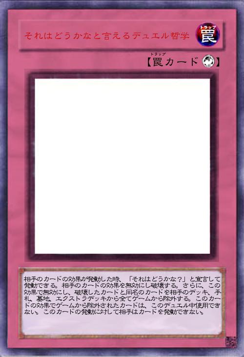 | 相手のカードの効果が発動した時、「それはどうかな?」と宣言して発動できる。相手のカードの効果を無効にし破壊する。さらに、この効果で無効にし、破壊したカードと同名のカードを相手のデッキ、手札、墓地、エクストラデッキから全てゲームから除外する。このカードの効果でゲームから除外されたカードは、このデュエル中使用できない。このカードの発動に対して相手はカードを発動できない。 | |||