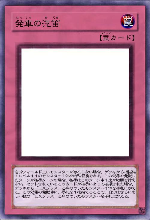 | 自分フィールド上にモンスターが存在しない場合、デッキから機械族・レベル11のモンスター1体を特殊召喚できる。この効果を発動したターンが相手ターンの場合、相手はこのターン中1度か戦闘を行えない。セットされているこのカードが相手によって破壊された場合、デッキから「EXプレス」と名のついたモンスター1体を手札に加える。この効果の発動時に、手札を1枚捨てることで、自分はさらにもう一枚の「EXプレス」と名のついたモンスターを手札に加える。 | |||