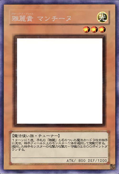 | 1ターンに1度、手札の「雅麗」と名のついた魔法カード3枚を相手に見せ、相手フィールド上のモンスター1体を選択して発動できる。選択した相手モンスターの攻撃力攻撃力・守備力は800ポイントダウンする。 | |||