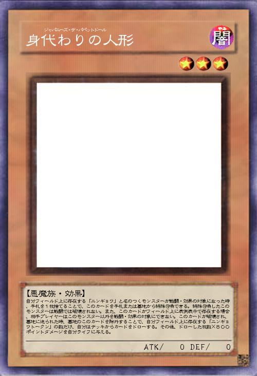 | 自分フィールド上に存在する「ニンギョウ」と名のつくモンスターが戦闘・効果の対象になった時、手札を1枚捨てることで、このカードを手札または墓地から特殊召喚できる。特殊召喚したこのモンスターは戦闘では破壊されない。また、このカードがフィールド上に表側表示で存在する場合、相手プレイヤーはこのモンスター以外を戦闘・効果の対象にできない。このカードが破壊され、墓地に送られた時、墓地のこのカードを除外することで、自分フィールド上に存在する「ニンギョウトークン」の数だけ、自分はデッキからカードをドローする。その後、ドローした枚数×800ポイントダメージを自分ライフに与える。 | |||