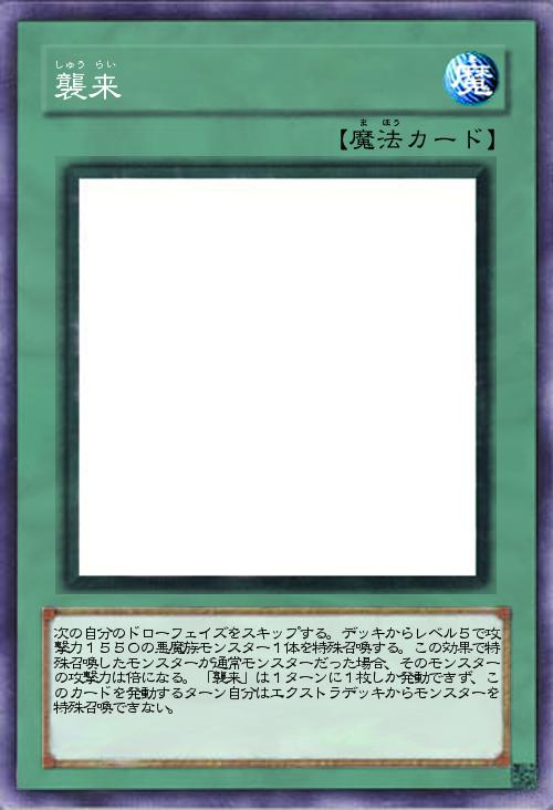 | 次の自分のドローフェイズをスキップする。デッキからレベル5で攻撃力1550の悪魔族モンスター1体を特殊召喚する。この効果で特殊召喚したモンスターが通常モンスターだった場合、そのモンスターの攻撃力は倍になる。「襲来」は1ターンに1枚しか発動できず、このカードを発動するターン自分はエクストラデッキからモンスターを特殊召喚できない。 | |||