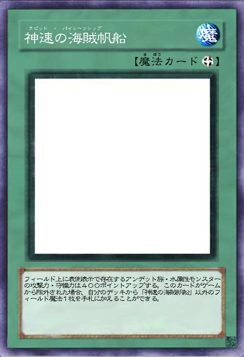 | フィールド上に表側表示で存在するアンデット族・水属性モンスターの攻撃力・守備力は400ポイントアップする。このカードがゲームから除外された場合、自分のデッキから「神速の海賊帆船」以外のフィールド魔法1枚を手札に加えることができる。 | |||
