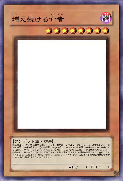| ①このカードが召喚に成功した時、デッキ・墓地からレベル2・アンデット族・通常モンスターをできる限り特殊召喚する。②この効果で特殊召喚したモンスターが戦闘で破壊された時、相手ライフに500ポイントのダメージを与える。③エンドフェイズ時にこのターン破壊されたモンスターの数だけ、墓地からレベル2以下のアンデット族・通常モンスターを特殊召喚できる。④自分フィールド上に、このカード以外のアンデット族モンスターがいる時、このカードを攻撃対象にできず、カードの対象にすることもできない。 | |||