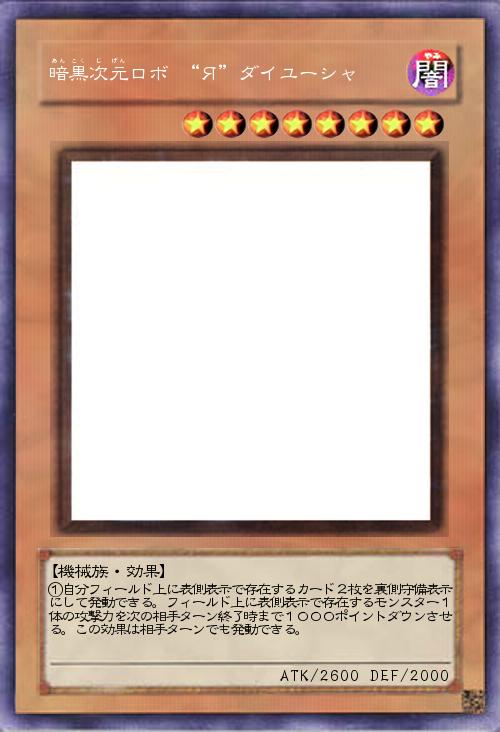 | ①自分フィールド上に表側表示で存在するカード2枚を裏側守備表示にして発動できる。フィールド上に表側表示で存在するモンスター1体の攻撃力を次の相手ターン終了時まで1000ポイントダウンさせる。この効果は相手ターンでも発動できる。 | |||