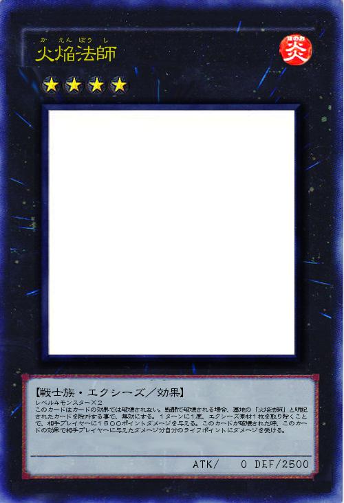 レベル4モンスター×2 このカードはカードの効果では破壊されない。戦闘で破壊される場合、墓地の「火焔法師」と明記されたカードを除外する事で、無効にする。1ターンに1度、エクシーズ素材1枚を取り除くことで、相手プレイヤーに1500ポイントダメージを与える。このカードが破壊された時、このカードの効果で相手プレイヤーに与えたダメージ分自分のライフポイントにダメージを受ける。 |