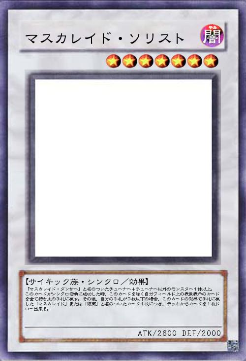 「マスカレイド・ダンサー」と名のついたチューナー+チューナー以外のモンスター1体以上。 このカードがシンクロ召喚に成功した時、このカードを除く自分フィールド上の表側表示のカードを全て持ち主の手札に戻す。その後、自分の手札が3枚以下の場合、このカードの効果で手札に戻した「マスカレイド」または「仮面」と名のついたカード1枚につき、デッキからカードを1枚ドロー出来る。 |