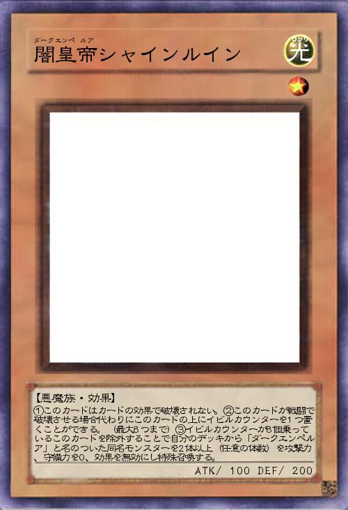 | ①このカードはカードの効果で破壊されない。②このカードが戦闘で破壊させる場合代わりにこのカードの上にイビルカウンターを1つ置くことができる。(最大8つまで)③イビルカウンターが8個乗っているこのカードを除外することで自分のデッキから「ダークエンペルア」と名のついた同名モンスターを2体以上(任意の体数)を攻撃力、守備力を0、効果を無効にし特殊召喚する。 | |||