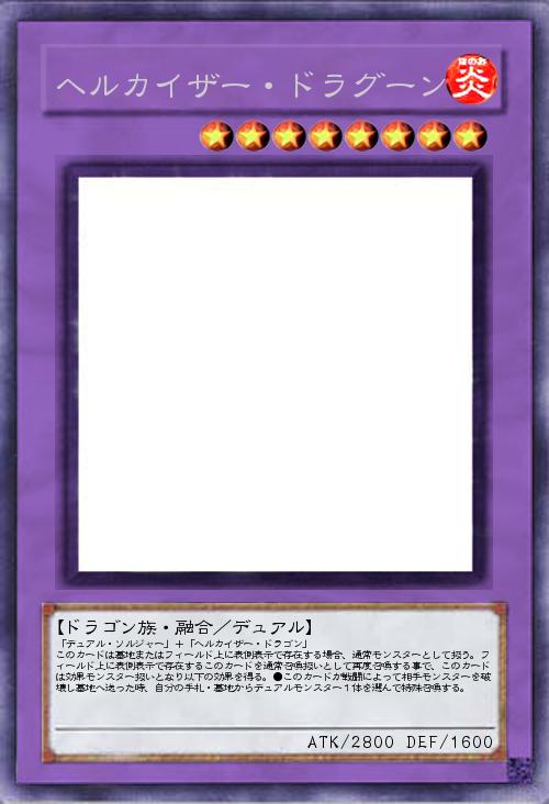 「デュアル・ソルジャー」+「ヘルカイザー・ドラゴン」 このカードは墓地またはフィールド上に表側表示で存在する場合、通常モンスターとして扱う。フィールド上に表側表示で存在するこのカードを通常召喚扱いとして再度召喚する事で、このカードは効果モンスター扱いとなり以下の効果を得る。●このカードが戦闘によって相手モンスターを破壊し墓地へ送った時、自分の手札・墓地からデュアルモンスター1体を選んで特殊召喚する。 |