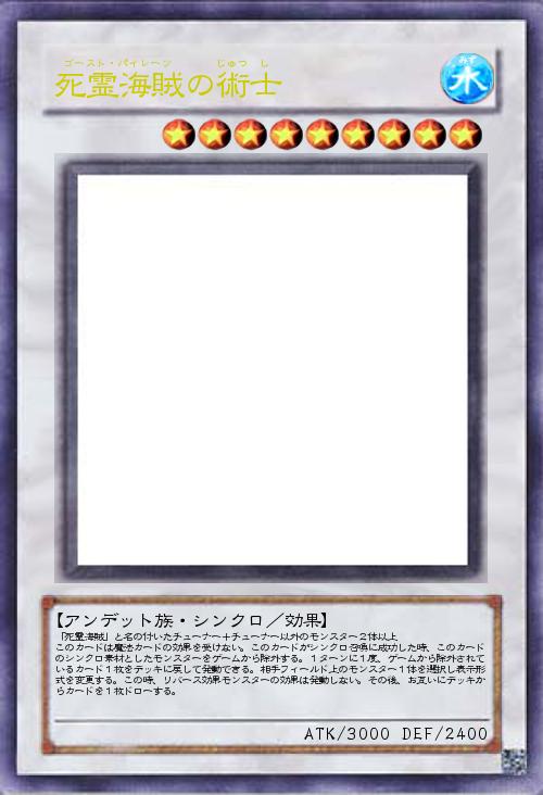 「死霊海賊」と名の付いたチューナー+チューナー以外のモンスター2体以上 このカードは魔法カードの効果を受けない。このカードがシンクロ召喚に成功した時、このカードのシンクロ素材としたモンスターをゲームから除外する。1ターンに1度、ゲームから除外されているカード1枚をデッキに戻して発動できる。相手フィールド上のモンスター1体を選択し表示形式を変更する。この時、リバース効果モンスターの効果は発動しない。その後、お互いにデッキからカードを1枚ドローする。 |