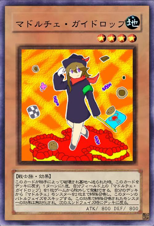 | このカードが相手によって破壊され墓地へ送られた時、このカードをデッキに戻す。1ターンに1度、自分フィールド上の「マドルチェ・ガイドロップ」を1枚ゲームから除外して発動できる。自分のデッキから「マドルチェ」モンスターを2枚まで特殊召喚し、このターンのバトルフェイズをスキップする。この効果で特殊召喚されたモンスターの効果は無効化され、次のエンドフェイズ時にデッキに戻る。 | |||