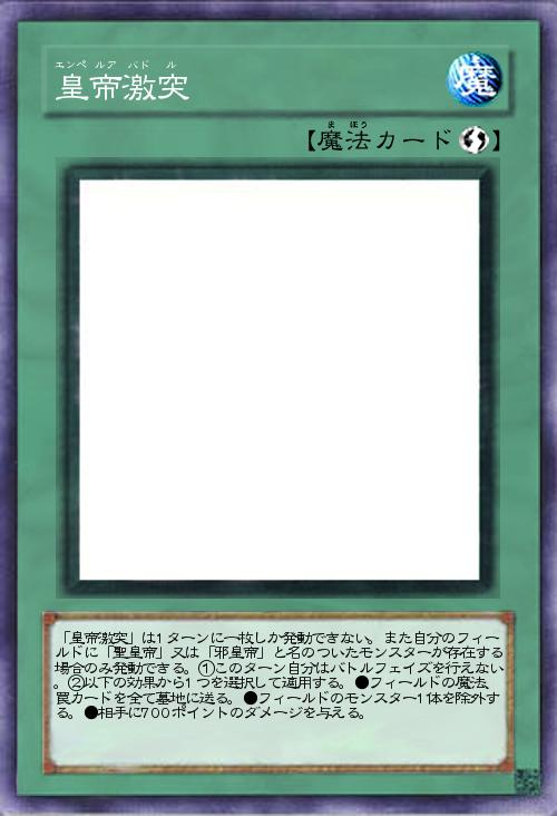| 「皇帝激突」は1ターンに一枚しか発動できない。また自分のフィールドに「聖皇帝」又は「邪皇帝」と名のついたモンスターが存在する場合のみ発動できる。①このターン自分はバトルフェイズを行えない。②以下の効果から1つを選択して適用する。●フィールドの魔法、罠カードを全て墓地に送る。●フィールドのモンスター1体を除外する。●相手に700ポイントのダメージを与える。 | |||