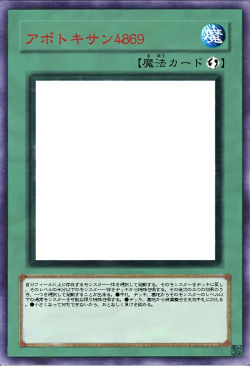 | 自分フィールド上に存在するモンスター一体を選択して発動する。そのモンスターをデッキに戻し、そのレベルの半分以下のモンスター一体をデッキから特殊召喚する。その後次の三つの効果のうち、一つを選択して発動することが出来る。●手札、デッキ、墓地からそのモンスターのレベル以下の通常モンスターを可能な限り特殊召喚する。●デッキ、墓地から装備魔法を五枚手札に加える。●小さくなって何もできないから、おとなしく負けを認める。 | |||