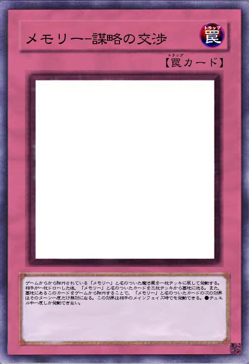 | ゲームからから除外されている「メモリー」と名のついた魔法罠を一枚デッキに戻して発動する。相手が一枚ドローした後、「メモリー」と名のついたカードを三枚デッキから墓地に送る。また、墓地にあるこのカードをゲームから除外することで、「メモリー」と名のついたカードの次の効果はそのターン一度だけ無効になる。この効果は相手のメインフェイズ時でも発動できる。●デュエル中一度しか発動できない。 | |||