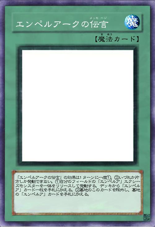 | 「エンペルアークの伝言」の効果は1ターンに一度①、②いづれか片方しか発動できない。①自分のフィールドの「エンペルア」エクシーズモンスターを一体をリリースして発動する。デッキから「エンペルア」カード一枚を手札に加える。②墓地のこのカードを除外し、墓地の「エンペルア」カードを手札に加える。 | |||