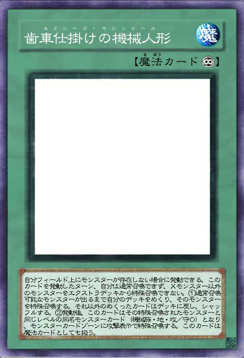 | 自分フィールド上にモンスターが存在しない場合に発動できる。このカードを発動したターン、自分は通常召喚できず、Xモンスター以外のモンスターをエクストラデッキから特殊召喚できない。①通常召喚可能なモンスターが出るまで自分のデッキをめくり、そのモンスターを特殊召喚する。それ以外のめくったカードはデッキに戻し、シャッフルする。②発動後、このカードはその特殊召喚されたモンスターと同じレベルの同名モンスターカード(機械族・地・攻/守0)となり、モンスターカードゾーンに攻撃表示で特殊召喚する。このカードは魔法カードとしても扱う。 | |||