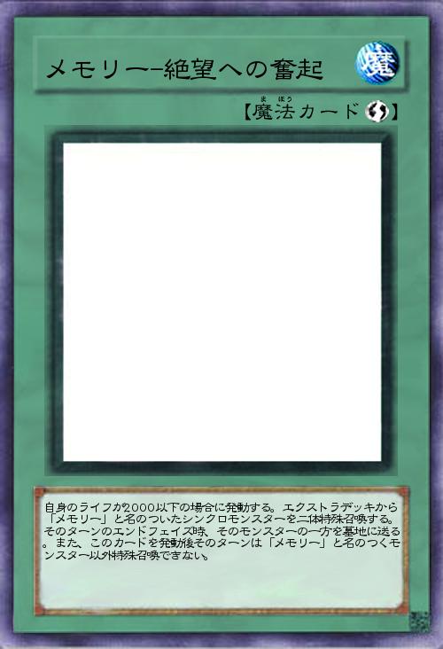 | 自身のライフが2000以下の場合に発動する。エクストラデッキから「メモリー」と名のついたシンクロモンスターを二体特殊召喚する。そのターンのエンドフェイズ時、そのモンスターの一方を墓地に送る。また、このカードを発動後そのターンは「メモリー」と名のつくモンスター以外特殊召喚できない。 | |||