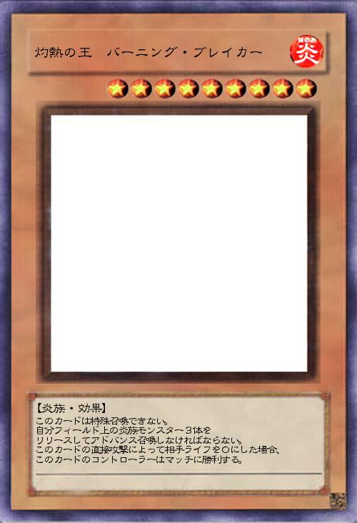 このカードは特殊召喚できない。 自分フィールド上の炎族モンスター3体を リリースしてアドバンス召喚しなければならない。 このカードの直接攻撃によって相手ライフを0にした場合、 このカードのコントローラーはマッチに勝利する。 |