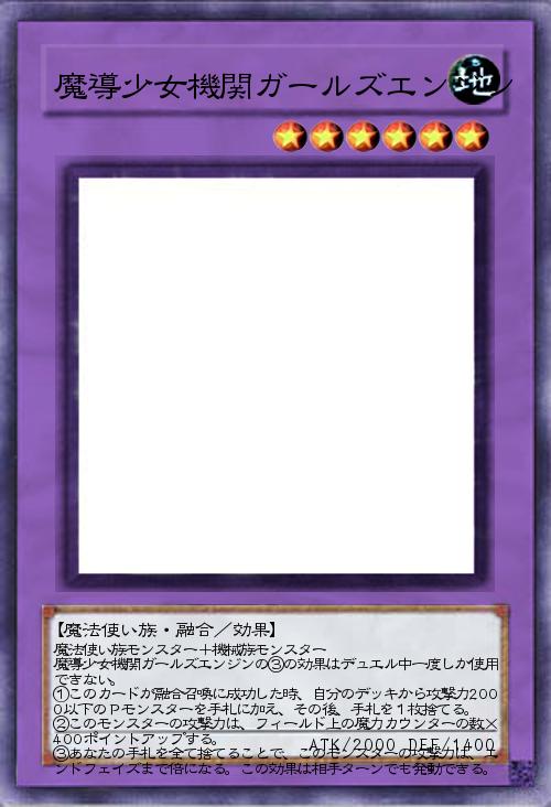 魔法使い族モンスター+機械族モンスター 魔導少女機関ガールズエンジンの③の効果はデュエル中一度しか使用できない。 ①このカードが融合召喚に成功した時、自分のデッキから攻撃力2000以下のPモンスターを手札に加え、その後、手札を1枚捨てる。 ②このモンスターの攻撃力は、フィールド上の魔力カウンターの数×400ポイントアップする。 ③あなたの手札を全て捨てることで、このモンスターの攻撃力は、エンドフェイズまで倍になる。この効果は相手ターンでも発動できる。 |