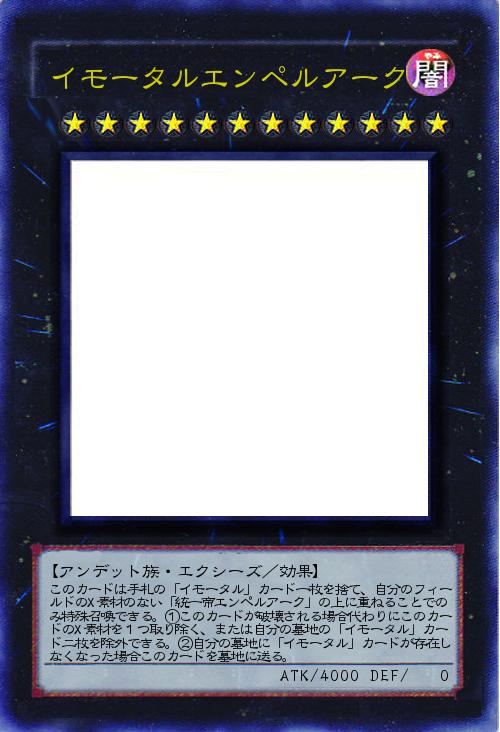 | このカードは手札の「イモータル」カード一枚を捨て、自分のフィールドのX素材のない「統一帝エンペルアーク」の上に重ねることでのみ特殊召喚できる。①このカードが破壊される場合代わりにこのカードのX素材を1つ取り除く、または自分の墓地の「イモータル」カード二枚を除外できる。②自分の墓地に「イモータル」カードが存在しなくなった場合このカードを墓地に送る。 | |||