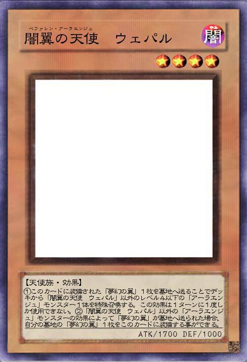 | ①このカードに装備された「夢幻の翼」1枚を墓地へ送ることでデッキから「闇翼の天使 ウェパル」以外のレベル4以下の「アーラエンジュ」モンスター1体を特殊召喚する。この効果は1ターンに1度しか使用できない。②「闇翼の天使 ウェパル」以外の「アーラエンジュ」モンスターの効果によって「夢幻の翼」が墓地へ送られた場合、自分の墓地の「夢幻の翼」1枚をこのカードに装備する事ができる。 | |||