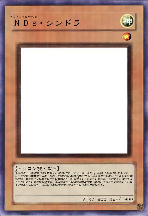| ①このカードは通常召喚できない。自分の手札、フィールド上から「NDs」と名のついたモンスターを合計6種類ゲームから除外した場合のみ特殊召喚できる。②このカードがフィールド上を離れた時、相手ライフに相手の手札の枚数×1000ポイントダメージを与え、自分ライフは相手に与えたダメージ分だけ回復する。③このカードの②の効果が発動した時、そのターンのエンドフェイズ時までこのカードの②の効果以外の全てのカードの効果を無効にする。 | |||