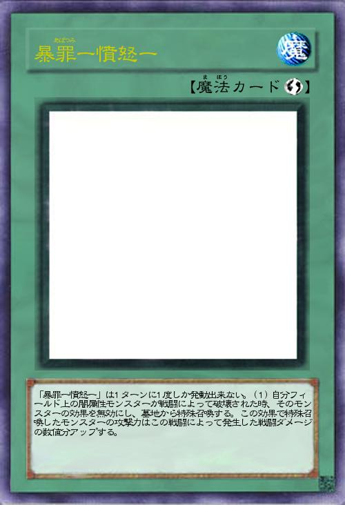 | 「暴罪ー憤怒ー」は1ターンに1度しか発動出来ない。(1)自分フィールド上の闇属性モンスターが戦闘によって破壊された時、そのモンスターの効果を無効にし、墓地から特殊召喚する。この効果で特殊召喚したモンスターの攻撃力はこの戦闘によって発生した戦闘ダメージの数値分アップする。 | |||