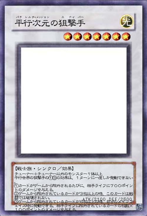 チューナー+チューナー以外のモンスター1体以上 平行世界の狙撃手の①③の効果は、1ターンに一度しか発動できない。 ①カードがゲームから除外されるたびに、相手ライフに700ポイントのダメージを与える。 ②ゲームから除外されているカードが3枚以上の時、このカードは戦闘では破壊されない。 ③ゲームから除外されているカードが6枚以上の時、自分のメインフェイズ時に発動できる。相手ライフに除外されているカードの枚数×100ポイントのダメージを与える。 |
