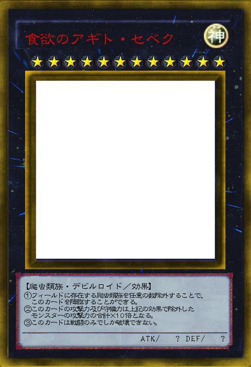 ①フィールドに存在する爬虫類族を任意の数除外することで、 このカードを降臨することができる。 ②このカードの攻撃力及び守備力は上記の効果で除外した モンスターの攻撃力の合計×10倍となる。 ③このカードは戦闘のみでしか破壊できない。 |