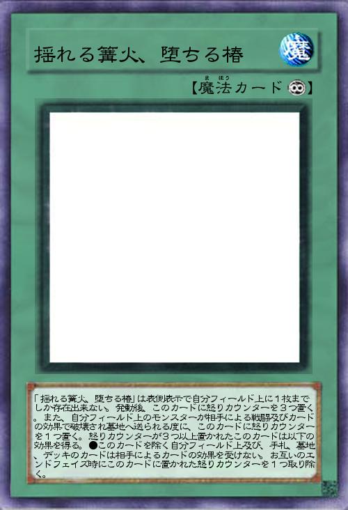 | 「揺れる篝火、堕ちる椿」は表側表示で自分フィールド上に1枚までしか存在出来ない。発動後、このカードに怒りカウンターを3つ置く。また、自分フィールド上のモンスターが相手による戦闘及びカードの効果で破壊され墓地へ送られる度に、このカードに怒りカウンターを1つ置く。怒りカウンターが3つ以上置かれたこのカードは以下の効果を得る。●このカードを除く自分フィールド上及び、手札、墓地、デッキのカードは相手によるカードの効果を受けない。お互いのエンドフェイズ時にこのカードに置かれた怒りカウンターを1つ取り除く。 | |||