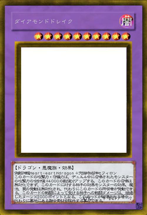 偽骸神龍Heart-eartHdragon+究極時戒神セフィロン このカードの攻撃力・守備力は、デュエル中に召喚されたモンスターの攻撃力の合計値+4000の数値分アップする。このカードの召喚は無効化できず、このカードに対する相手の効果モンスターの効果、魔法、罠の発動は無効化され、代わりにこのカードの所有者が発動できる。このカードの戦闘によって受ける相手への戦闘ダメージは、経過したターン×2000ポイントとなる。このカードが破壊される場合、代わりに墓地にある融合素材を除外する事ができる。 |