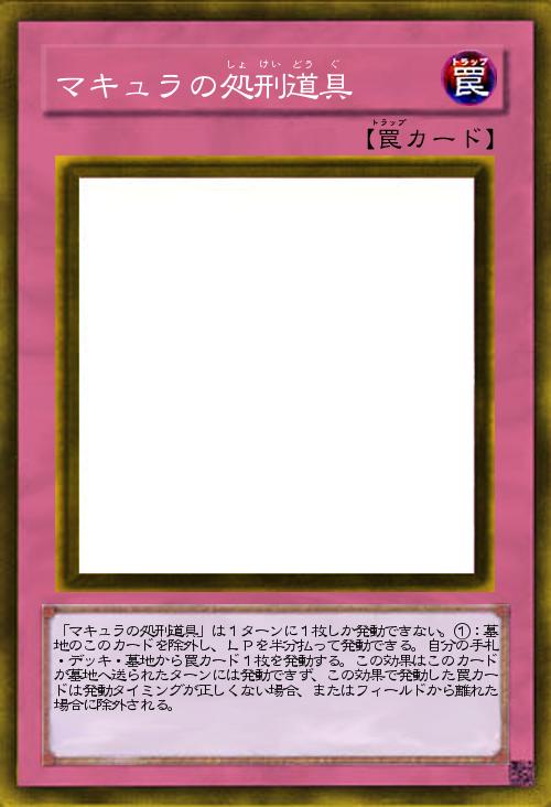 | 「マキュラの処刑道具」は1ターンに1枚しか発動できない。①:墓地のこのカードを除外し、LPを半分払って発動できる。自分の手札・デッキ・墓地から罠カード1枚を発動する。この効果はこのカードが墓地へ送られたターンには発動できず、この効果で発動した罠カードは発動タイミングが正しくない場合、またはフィールドから離れた場合に除外される。 | |||
