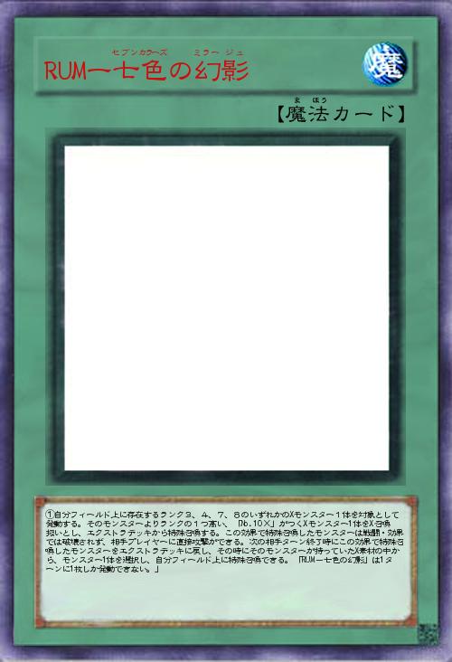 | ①自分フィールド上に存在するランク3、4、7、8のいずれかのXモンスター1体を対象として発動する。そのモンスターよりランクの1つ高い、「No.10×」がつくXモンスター1体をX召喚扱いとし、エクストラデッキから特殊召喚する。この効果で特殊召喚したモンスターは戦闘・効果では破壊されず、相手プレイヤーに直接攻撃ができる。次の相手ターン終了時にこの効果で特殊召喚したモンスターをエクストラデッキに戻し、その時にそのモンスターが持っていたX素材の中から、モンスター1体を選択し、自分フィールド上に特殊召喚できる。「RUM-七色の幻影」は1ターンに1枚しか発動できない。」 | |||