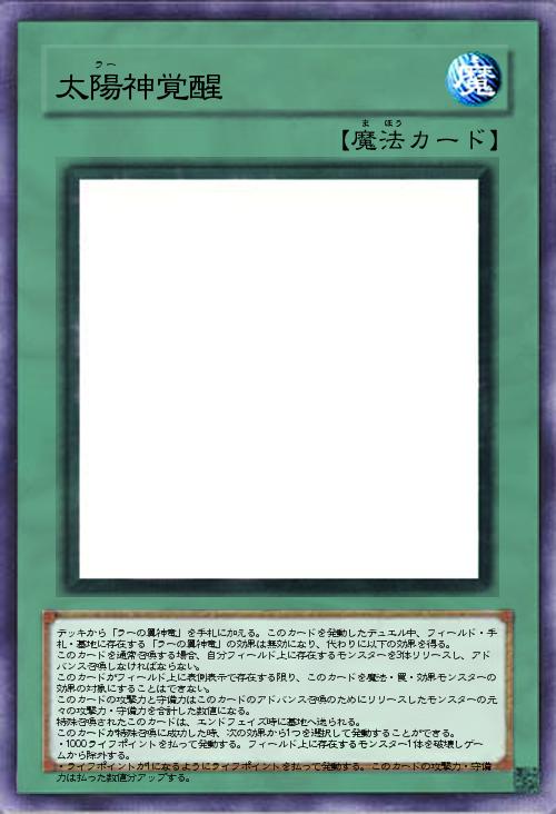 デッキから「ラーの翼神竜」を手札に加える。このカードを発動したデュエル中、フィールド・手札・墓地に存在する「ラーの翼神竜」の効果は無効になり、代わりに以下の効果を得る。 このカードを通常召喚する場合、自分フィールド上に存在するモンスターを3体リリースし、アドバンス召喚しなければならない。 このカードがフィールド上に表側表示で存在する限り、このカードを魔法・罠・効果モンスターの効果の対象にすることはできない。 このカードの攻撃力と守備力はこのカードのアドバンス召喚のためにリリースしたモンスターの元々の攻撃力・守備力を合計した数値になる。 特殊召喚されたこのカードは、エンドフェイズ時に墓地へ送られる。 このカードが特殊召喚に成功した時、次の効果から1つを選択して発動することができる。 ・1000ライフポイントを払って発動する。フィールド上に存在するモンスター1体を破壊しゲームから除外する。 ・ |