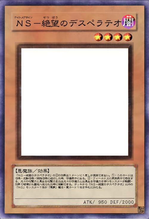 | 「NS-絶望のデスペラテオ」の②の効果は1ターンに1度しか使用できない。①:このカードは召喚・反転召喚・特殊召喚に成功した時、守備表示になる。②:フィールド上に表側表示で存在する、元々の攻撃力と異なる攻撃力または元々の守備力とは異なる守備力を持つモンスターが戦闘・効果で破壊され墓地へ送られた時に発動できる。デッキから「NS-絶望のデスペラテオ」以外の「NS」モンスター1体か「悪夢」魔法・罠カード1枚を手札に加える。 | |||