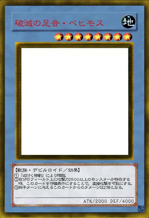 ①「近付く惨劇」により降臨。 ②自分のフィールド上に攻撃力2500以上のモンスターが存在する 時、このカードを守備表示にすることで、直接攻撃を可能にする。 ③相手ターンに与えるこのカードからのダメージは2倍となる。 |