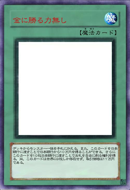 | デッキからモンスター一体を手札に加える。また、このカードを日本銀行に渡すことで日本銀行から10万円を得ることができる。さらにこのカードを10枚日本銀行に渡すことでお札を自由に刷る権利を得る。尚、このカードは世界に9枚しか存在せず、取引価格は11万円である。 | |||
