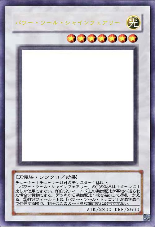 チューナー+チューナー以外のモンスター1体以上 「パワー・ツール・シャインフェアリー」の①の効果は1ターンに1度しか使用できない。①自分フィールド上の装備魔法が墓地へ送られた場合に発動できる。デッキから装備魔法1枚を選択して手札に加える。②自分フィールド上に「パワー・ツール・ドラゴン」が表側表示で存在する限り、相手はこのカードを攻撃対象に選択できない。 |