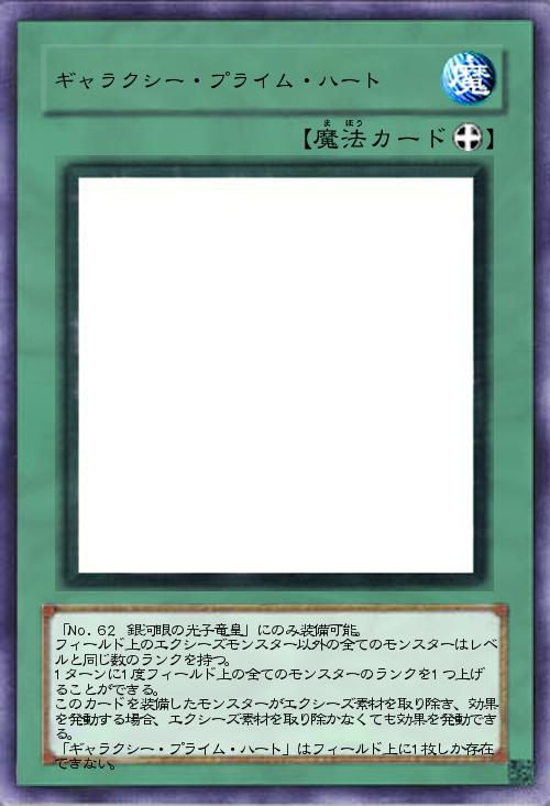「No.62 銀河眼の光子竜皇」にのみ装備可能。 フィールド上のエクシーズモンスター以外の全てのモンスターはレベルと同じ数のランクを持つ。 1ターンに1度フィールド上の全てのモンスターのランクを1つ上げることができる。 このカードを装備したモンスターがエクシーズ素材を取り除き、効果を発動する場合、エクシーズ素材を取り除かなくても効果を発動できる。 「ギャラクシー・プライム・ハート」はフィールド上に1枚しか存在できない。 |