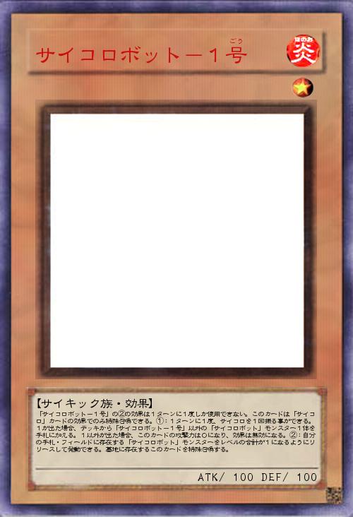 | 「サイコロボット-1号」の②の効果は1ターンに1度しか使用できない。このカードは「サイコロ」カードの効果でのみ特殊召喚できる。①:1ターンに1度、サイコロを1回振る事ができる。1が出た場合、デッキから「サイコロボット-1号」以外の「サイコロボット」モンスター1体を手札に加える。1以外が出た場合、このカードの攻撃力は0になり、効果は無効になる。②:自分の手札・フィールドに存在する「サイコロボット」モンスターをレベルの合計が1になるようにリリースして発動できる。墓地に存在するこのカードを特殊召喚する。 | |||
