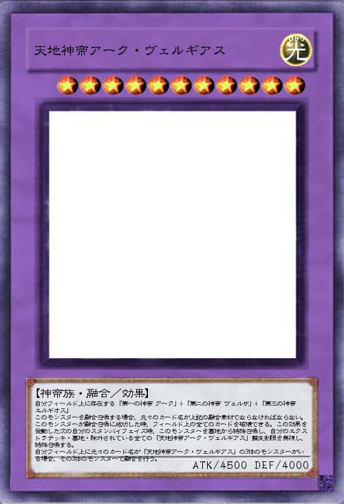 自分フィールド上に存在する「第一の神帝 アーク」+「第二の神帝 ヴェルザ」+「第三の神帝 エルギオス」 このモンスターを融合召喚する場合、元々のカード名が上記の融合素材でならなければならない。 このモンスターが融合召喚に成功した時、フィールド上の全てのカードを破壊できる。この効果を発動した次の自分のスタンバイフェイズ時、このモンスターを墓地から特殊召喚し、自分のエクストラデッキ・墓地・除外されている全ての「天地神帝アーク・ヴェルギアス」蘇生制限を無視し、特殊召喚する。 自分フィールド上に元々のカード名が「天地神帝アーク・ヴェルギアス」の3体のモンスターがいる場合、その3体のモンスターで融合を行う。 |