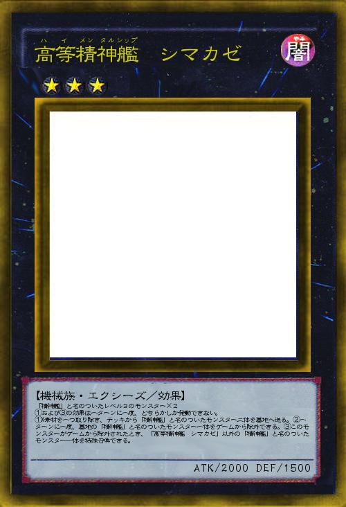 「精神艦」と名のついたレベル3のモンスター×2 ①および③の効果は一ターンに一度、どちらかしか発動できない。 ①X素材を一つ取り除き、デッキから「精神艦」と名のついたモンスター二体を墓地へ送る。②一ターンに一度、墓地の「精神艦」と名のついたモンスター一体をゲームから除外できる。③このモンスターがゲームから除外されたとき、「高等精神艦 シマカゼ」以外の「精神艦」と名のついたモンスター一体を特殊召喚できる。 |