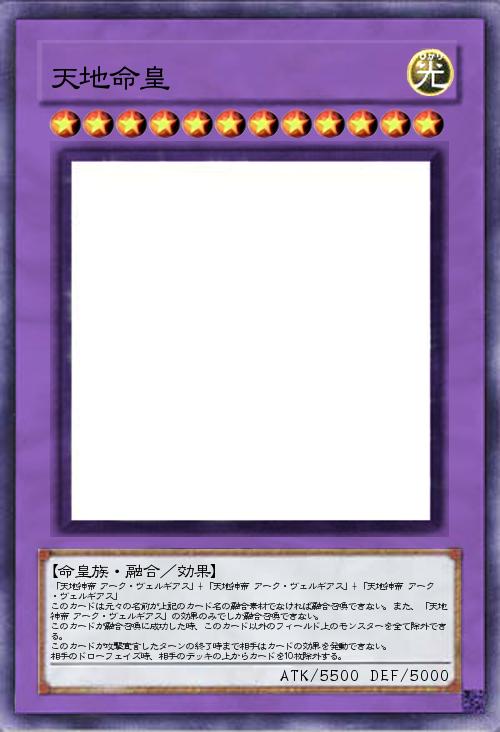 「天地神帝 アーク・ヴェルギアス」+「天地神帝 アーク・ヴェルギアス」+「天地神帝 アーク・ヴェルギアス」 このカードは元々の名前が上記のカード名の融合素材でなければ融合召喚できない。また、「天地神帝 アーク・ヴェルギアス」の効果のみでしか融合召喚できない。 このカードが融合召喚に成功した時、このカード以外のフィールド上のモンスターを全て除外できる。 このカードが攻撃宣言したターンの終了時まで相手はカードの効果を発動できない。 相手のドローフェイズ時、相手のデッキの上からカードを10枚除外する。 |