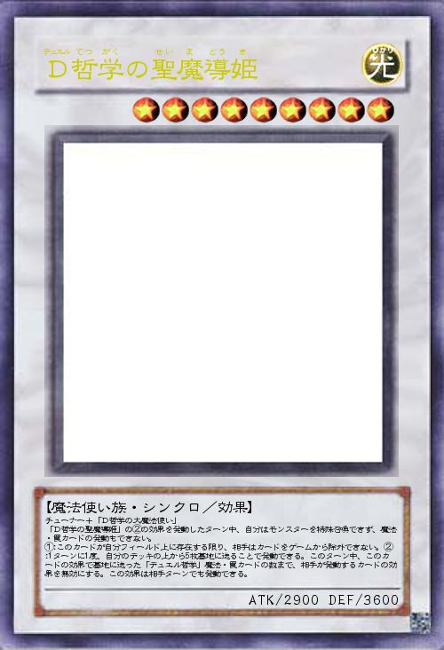 チューナー+「D哲学の大魔法使い」 「D哲学の聖魔導姫」の②の効果を発動したターン中、自分はモンスターを特殊召喚できず、魔法・罠カードの発動もできない。 ①:このカードが自分フィールド上に存在する限り、相手はカードをゲームから除外できない。②:1ターンに1度、自分のデッキの上から5枚墓地に送ることで発動できる。このターン中、このカードの効果で墓地に送った「デュエル哲学」魔法・罠カードの数まで、相手が発動するカードの効果を無効にする。この効果は相手ターンでも発動できる。 |