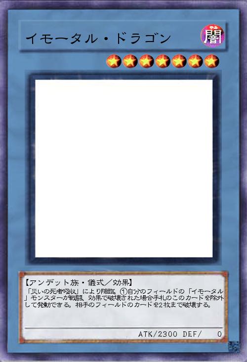 | 「災いの死者吸収」により降臨。①自分のフィールドの「イモータル」モンスターが戦闘、効果で破壊された場合手札のこのカードを除外して発動できる。相手のフィールドのカードを2枚まで破壊する。 | |||