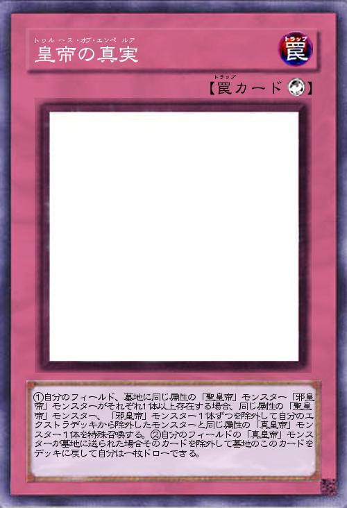 | ①自分のフィールド、墓地に同じ属性の「聖皇帝」モンスター「邪皇帝」モンスターがそれぞれ1体以上存在する場合、同じ属性の「聖皇帝」モンスター、「邪皇帝」モンスター1体ずつを除外して自分のエクストラデッキから除外したモンスターと同じ属性の「真皇帝」モンスター1体を特殊召喚する。②自分のフィールドの「真皇帝」モンスターが墓地に送られた場合そのカードを除外して墓地のこのカードをデッキに戻して自分は一枚ドローできる。 | |||