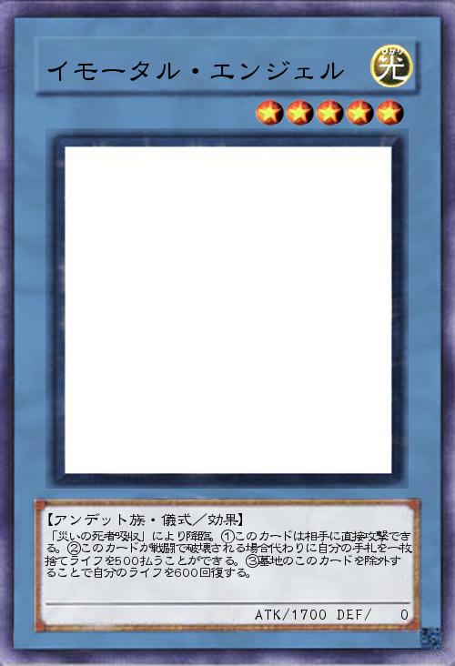 | 「災いの死者吸収」により降臨。①このカードは相手に直接攻撃できる。②このカードが戦闘で破壊される場合代わりに自分の手札を一枚捨てライフを500払うことができる。③墓地のこのカードを除外することで自分のライフを600回復する。 | |||