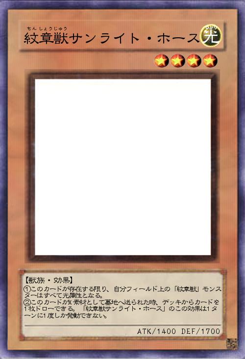 ①このカードが存在する限り、自分フィールド上の「紋章獣」モンスターはすべて光属性となる。 ②このカードがX素材として墓地へ送られた時、デッキからカードを1枚ドローできる。「紋章獣サンライト・ホース」のこの効果は1ターンに1度しか発動できない。 |